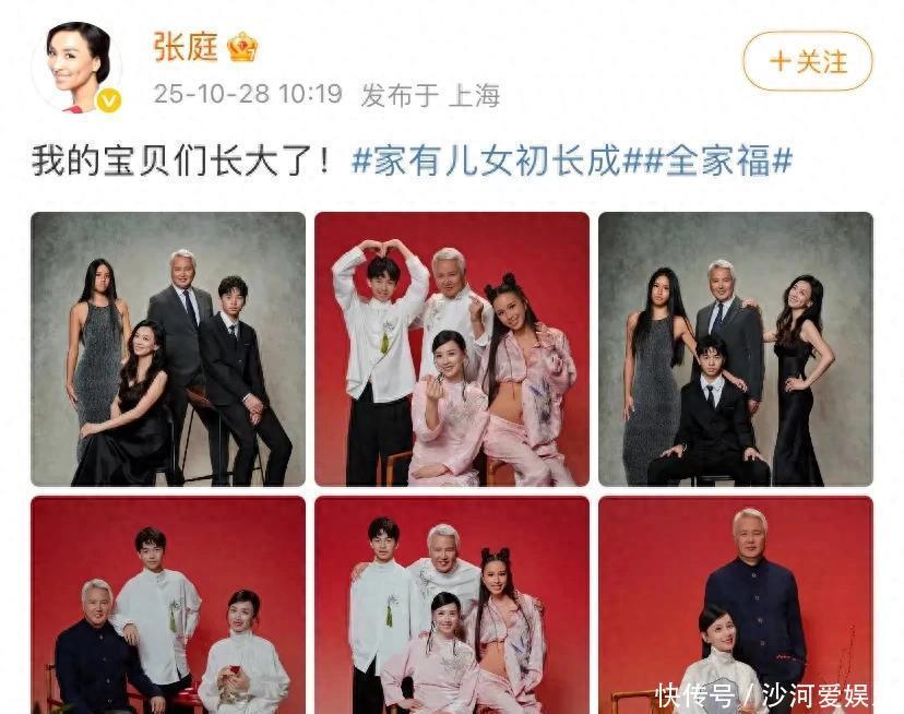 近日,张庭晒出了自己的全家福,包括她的老公林瑞阳,以及大女儿和小儿子,并配文“我的宝贝们长大了”。